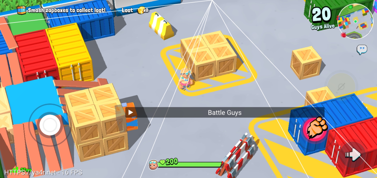 Battle Guys: Royale là một game bắn súng PvP từ trên xuống nhanh và thú vị, mỗi trận đấu chỉ kéo dài vài phút. Chiến đấu một mình hoặc theo cặp -> Nhảy dù xuống chiến trường, thu thập vật phẩm tăng sức mạnh, đánh bại đối thủ và sống sót trong một đấu trường mở được thiết kế cho hành động nhanh chóng.