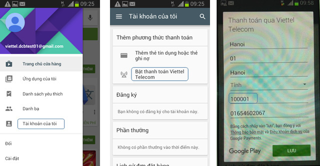 Theo thông tin mình đọc trên báo mạng được biết vào ngày 02/02/2016, Viettel sẽ hợp tác với CH Play cho phép người dùng điện thoại có thể mua hàng trên CH Play bằng phương thức dùng tài khoản điện thoại mạng Viettel để mua các ứng dụng thu phí thay vì trước đây đều dùng thẻ visa ngân hàng, cách thức là vào Tài khoản của tôi > Phương thức thanh toán chọn Telecom nhưng mình bấm vào chỉ thấy thanh toán bằng thẻ visa mà thôi. Mình cũng đã gọi hỗ trợ tổng đài Viettel 198 nó lại nói vòng vo tam quốc kêu mình gọi số 0168, mình cũng gọi nhưng cũng kêu gọi lại 198 làm mất hết 5k mà không ra cái ôn gì nên lên đây nhờ anh em giúp đỡ.