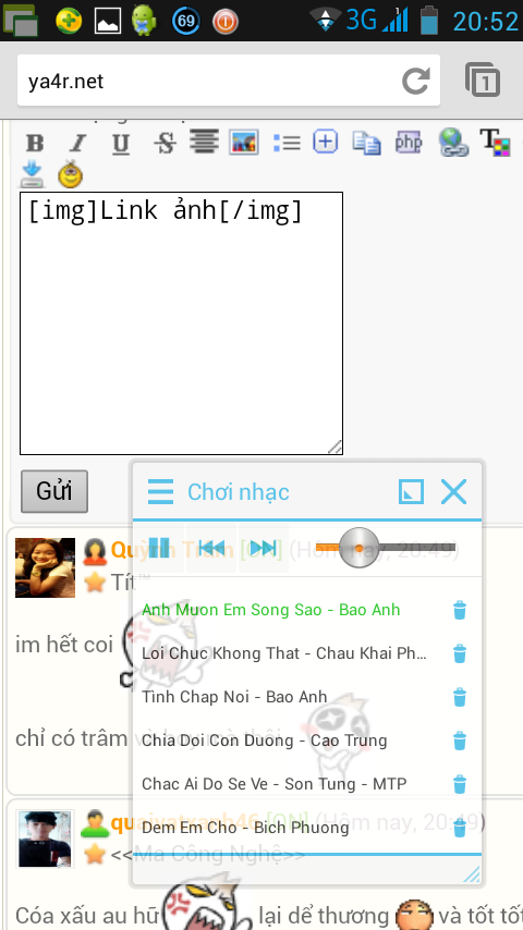 [img ]link hình[/img ] (xóa dấu cách nhá, hướng dẫn phải viết vậy nếu không hệ thống tưởng sd link hình, lỗi hiển thị ngay )Bấm nó ra [img] chứ sao. Au cóa gì au