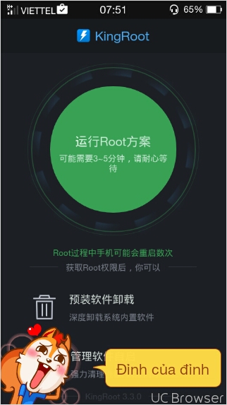 Anh ơi e làm rồi nhưng tới bước cuối vào kingroot bấm nút tròn to màu xanh nó cứ xoay tròn hoài không thành công e xài oppo neo5