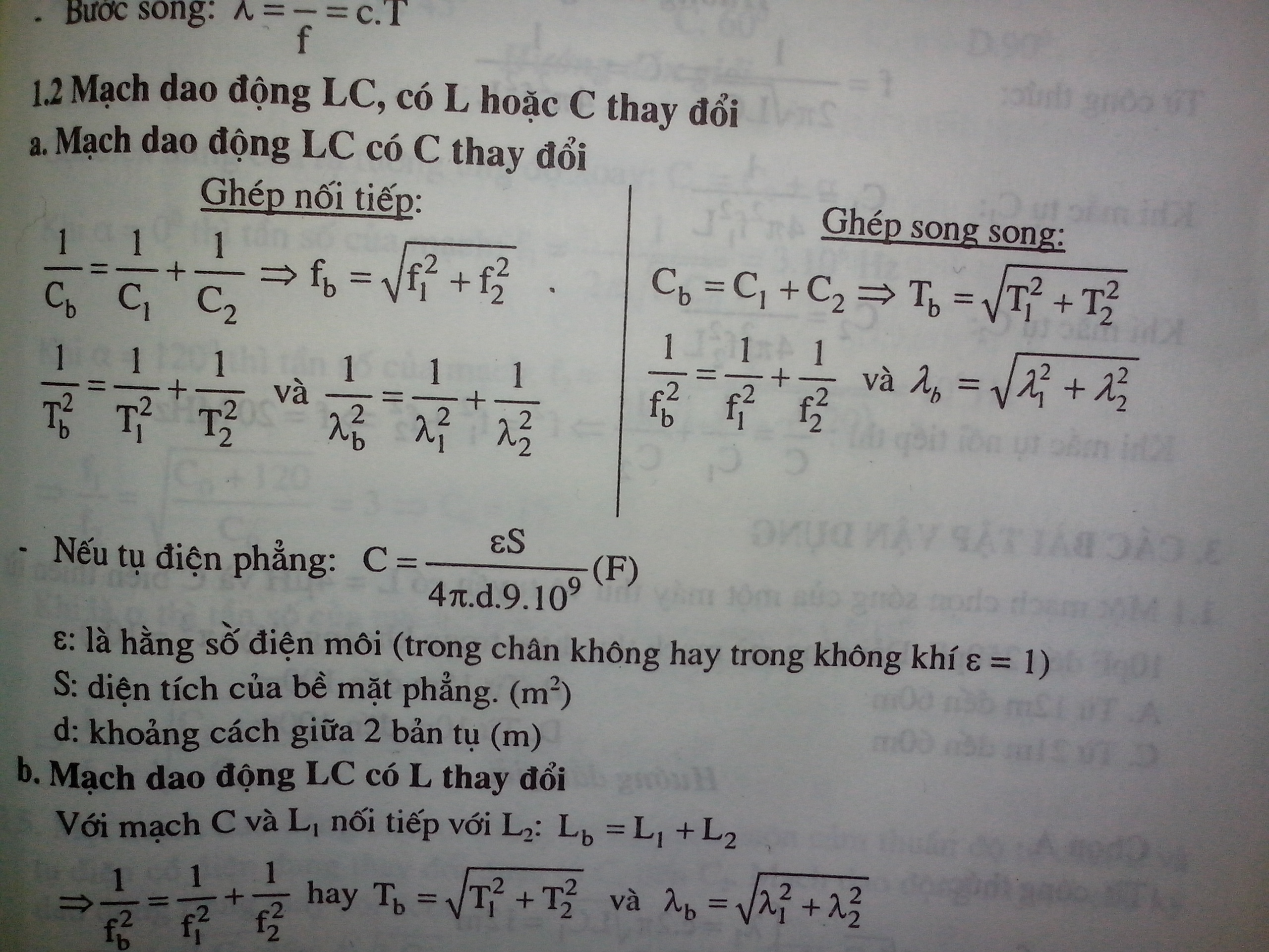 cho mach LC li tuong. voi C1 thi buoc song la 400. voi C2 thi buoc song la 480. Neu ghep C1 // C2 thi buoc song la bao nhieu . giai chi tiet gium "")của bạn đây. nhìn phần song song, có lamda bộ khi C1 song song C2. tự ráp số vào công thức nhé. chụp nhiều công thức cho lần sau bạn dùng luôn