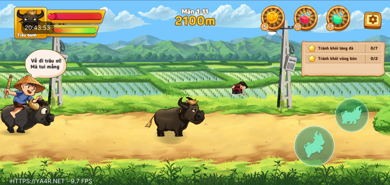 Hóa thân thành chú trâu dũng cảm, người bạn đồng hành quen thuộc nơi làng quê. Người chơi sẽ dẫn dắt trâu băng qua những cánh đồng, con đường làng và bãi bồi, vượt qua chướng ngại vật như hố bùn lầy, tảng đá cản đường hay ổ gà bất ngờ. Mỗi hành trình mở ra một khung cảnh nông thôn mộc mạc, đầy thử thách và khám phá thú vị.