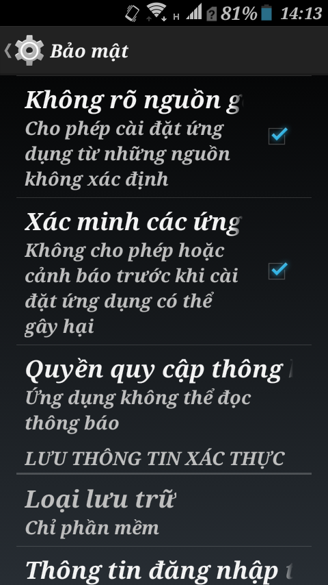 Lưu ý: Trước tiên cần vào cài đặt điện thoại sau đó vào bảo mật rồi đánh dấu vào ô không rõ nguồn gốc là cài đặt apk ở ngoài được