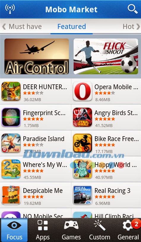 ứng dụng Mobo Market bạn có thể cài đặt ứng dụng, themes, wallpaper hoặc trò chơi trực tiếp từ điện thoại hoặc máy tính bảng và lưu file .apk để cài đặt offline